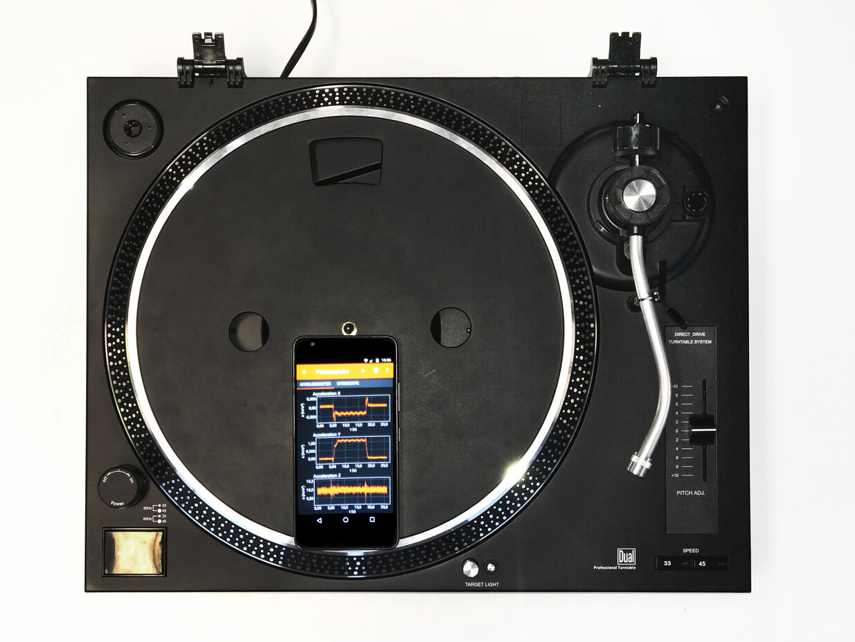 | Benötigte Materialien | Smartphone mit Gyroskop und die App phyphox, PC mit WLAN, Beamer, Plattenspieler (ideal mit Direktantrieb und Stroboskop), alternativ kugelgelagerter Drehteller und zur horizontalen Ausrichtung Papierstreifen (0,2 mm), Wasserwaage |