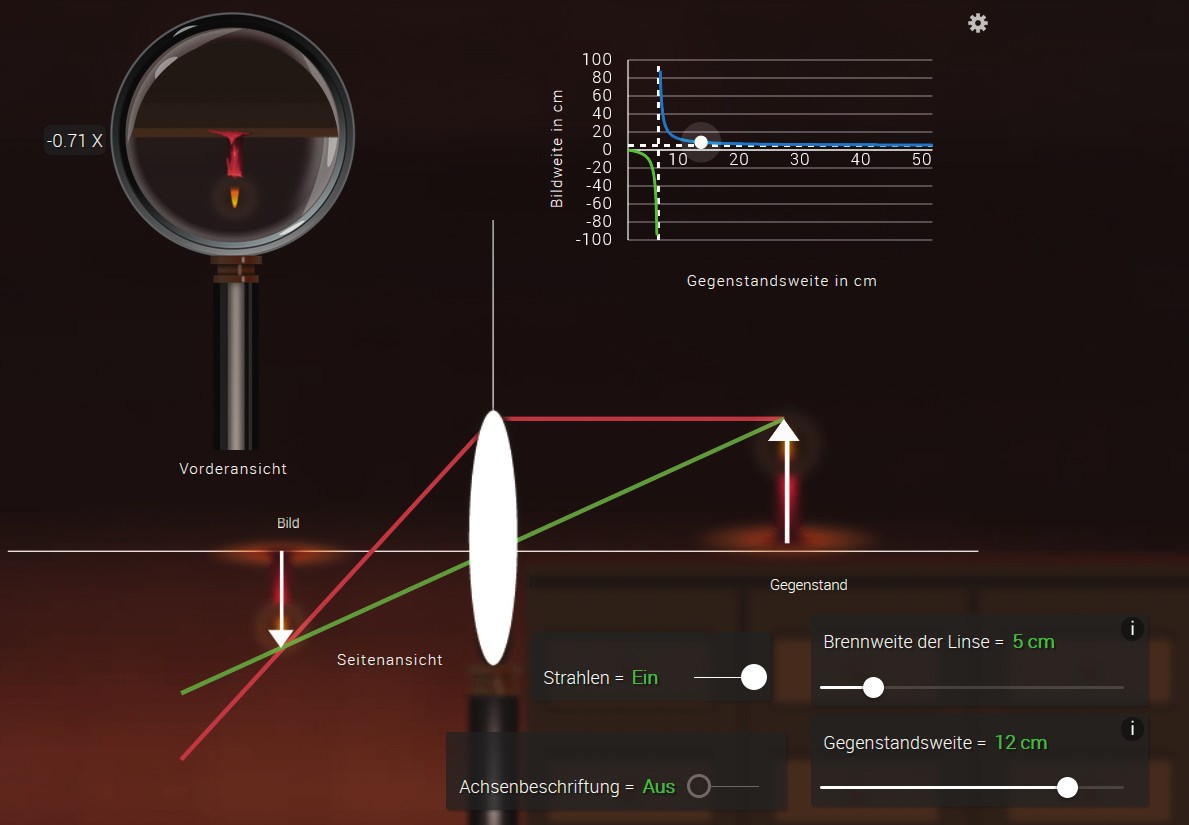 | Benötigte Materialien | Tablet, Notebook oder Desktop-PC und je nach Ausstattung optische Bänke mit Aufsätzen, Leuchtobjekten, Sammellinsen und Schirm, oder einfacher Lupen und weißes Papier / Pappe |